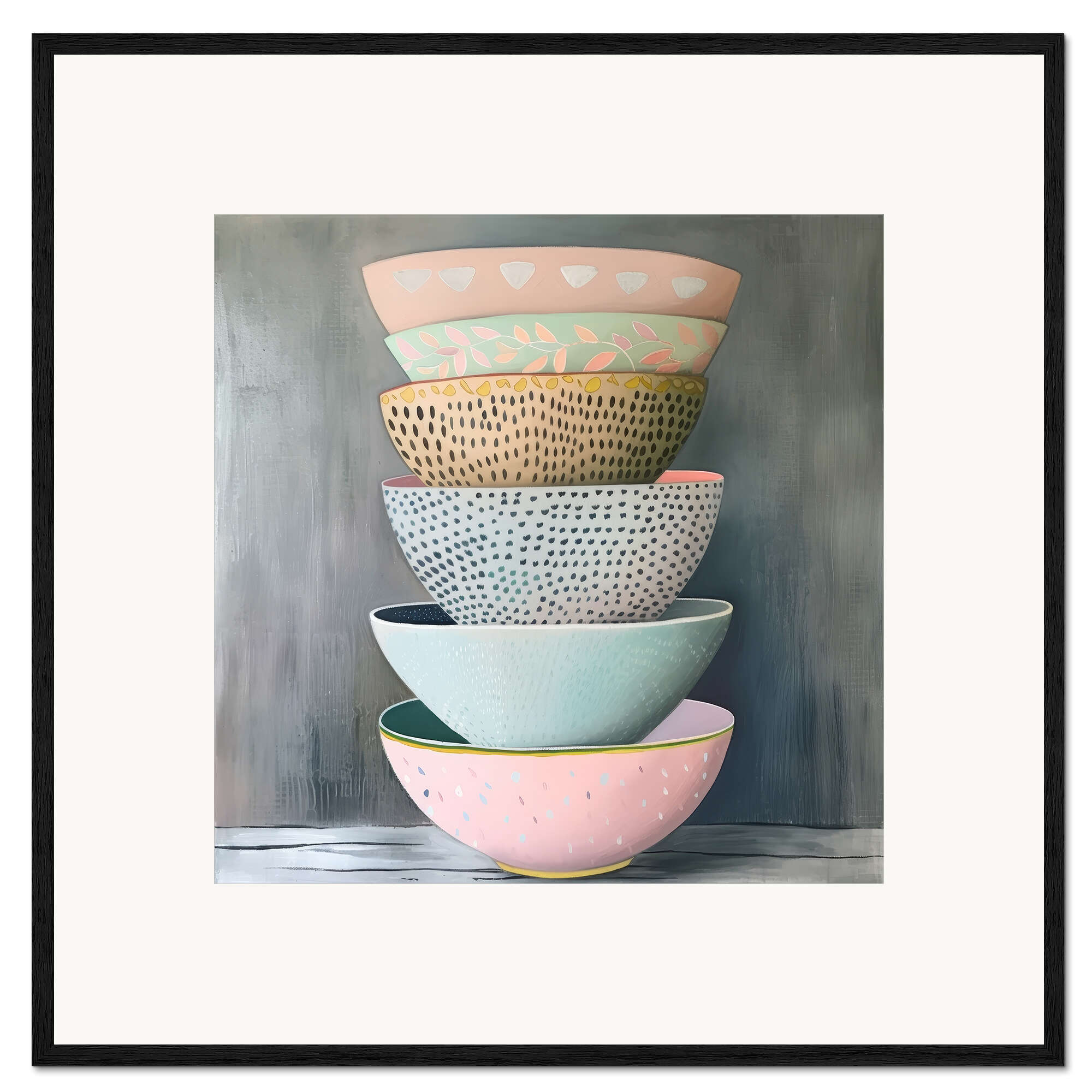 Gerahmter Kunstdruck Stapel pastellfarbener Keramiktöpfe