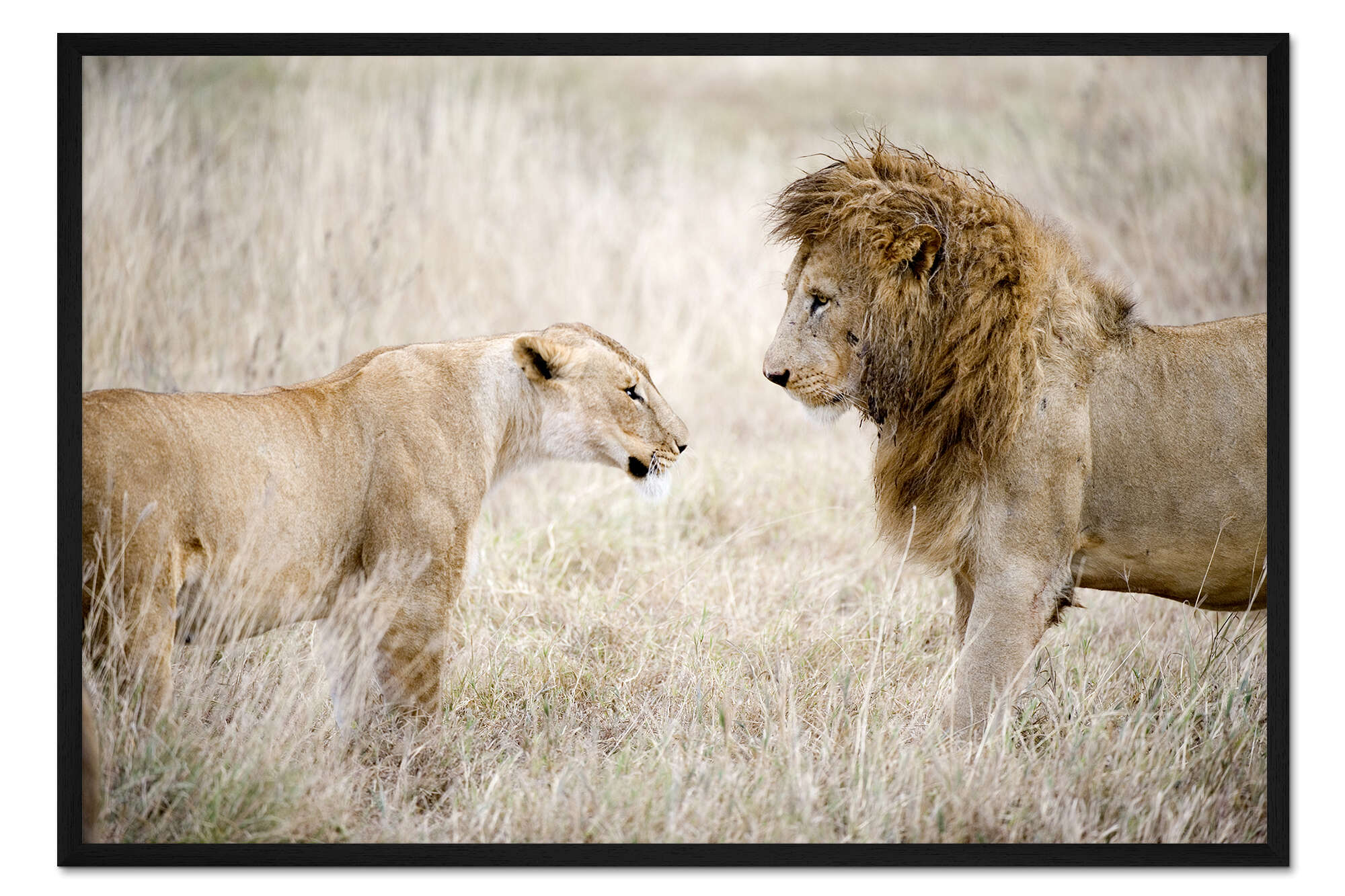 Posterlounge   Wandbilder   Fotografie   Todd Gustafson   Gerahmter Kunstdruck Löwin und ein Löwe stehen sich Auge in Auge gegenüber