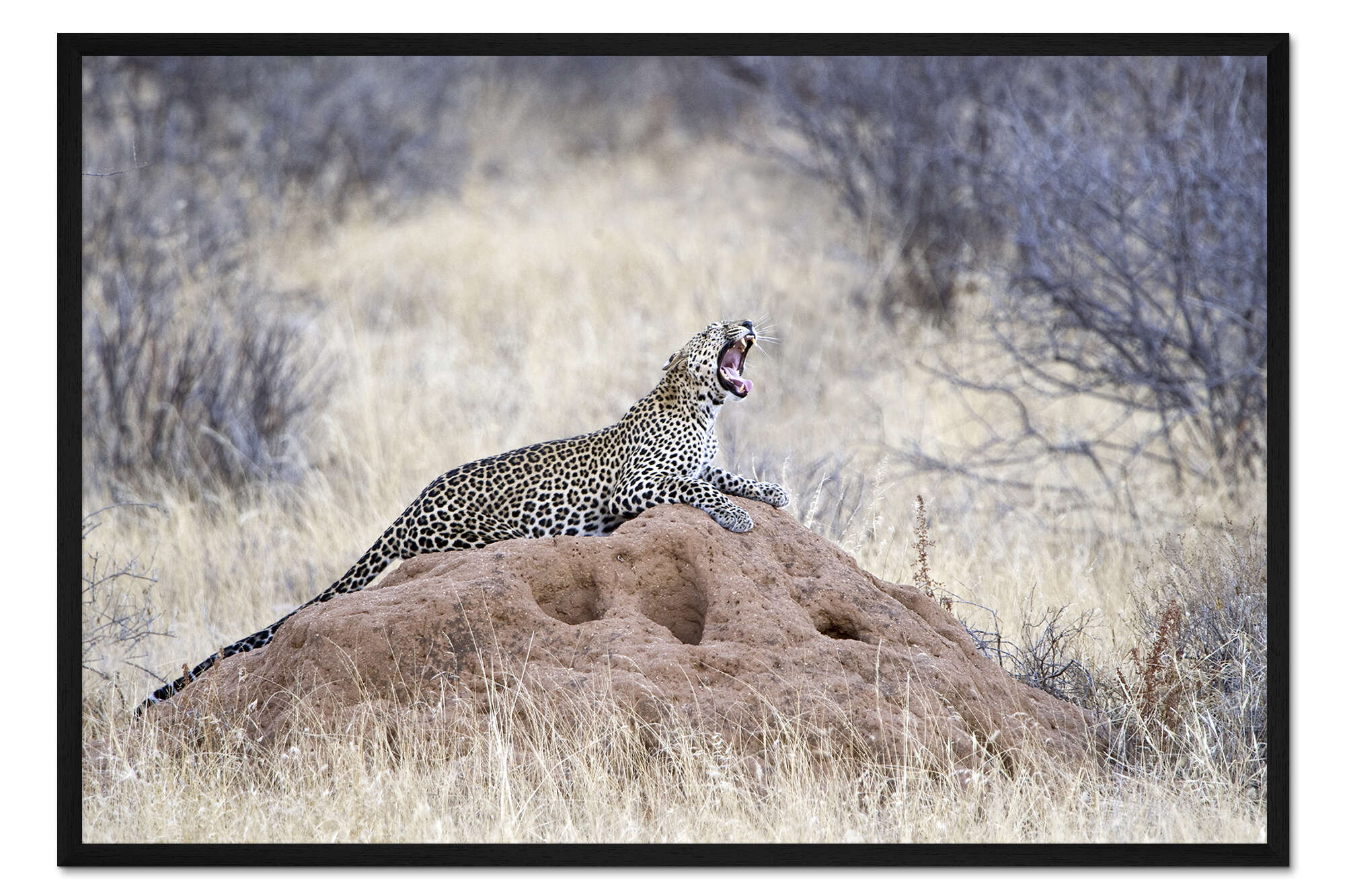 Posterlounge   Wandbilder   Fotografie   Todd Gustafson   Gerahmter Kunstdruck Leopard gähnend auf einem Termitenhügel