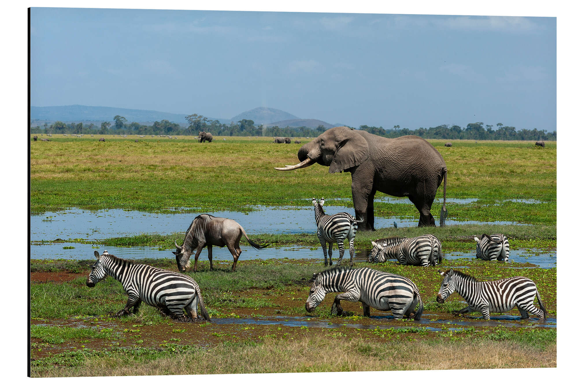 Posterlounge   Wandbilder   Fotografie   Jones & Shimlock   Magnettafel Elefant, Zebras und ein Gnu an einem Wasserloch, Amboseli-Nationalpark