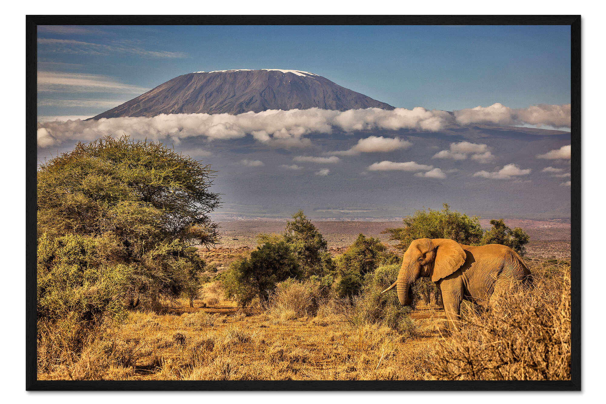 Posterlounge   Wandbilder   Fotografie   Jones & Shimlock   Gerahmter Kunstdruck Kilimandscharo mit Elefant, Amboseli-Nationalpark, Afrika