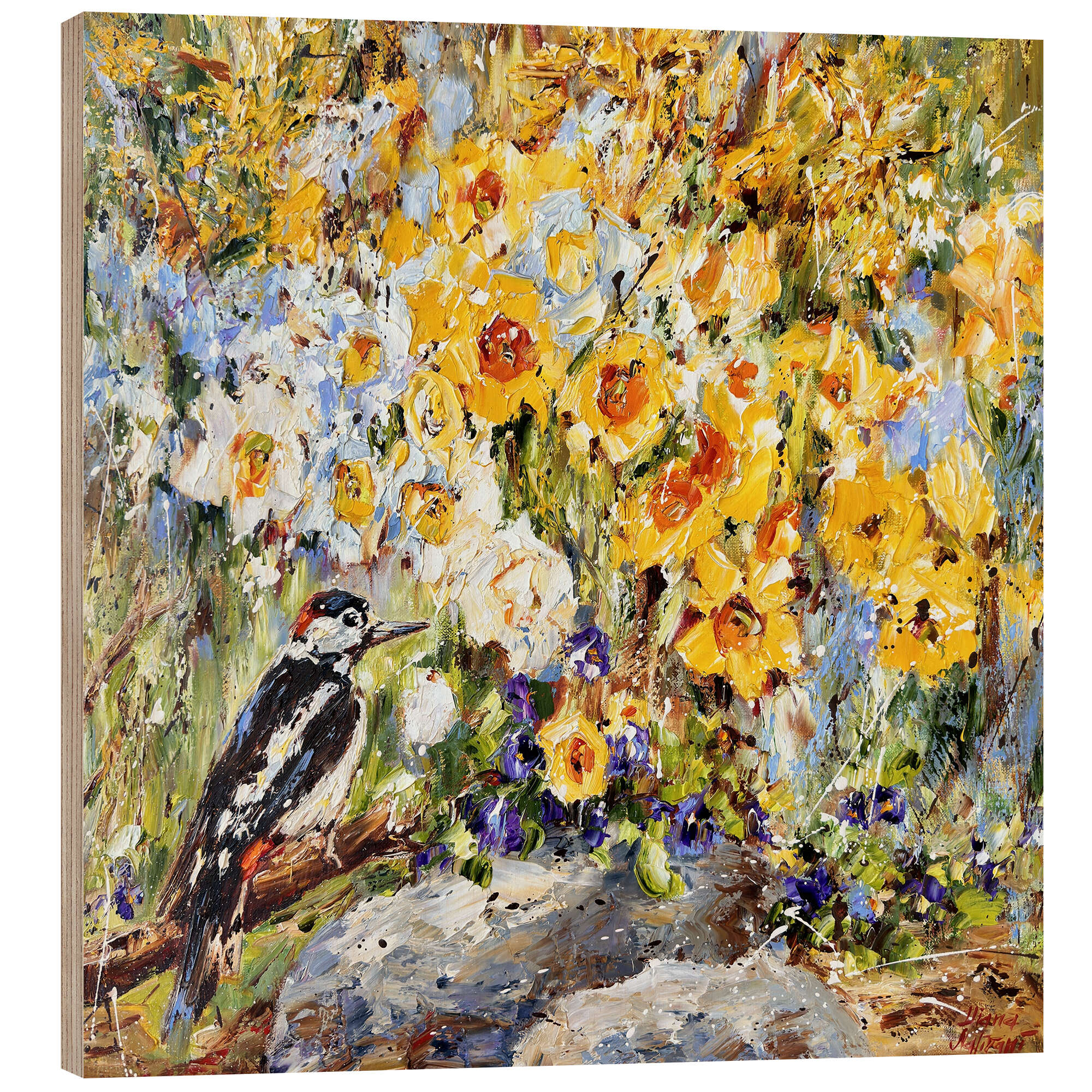 Posterlounge   Wandbilder   Blumen   Diana Malivani   Holzbild Buntspecht im Frühling