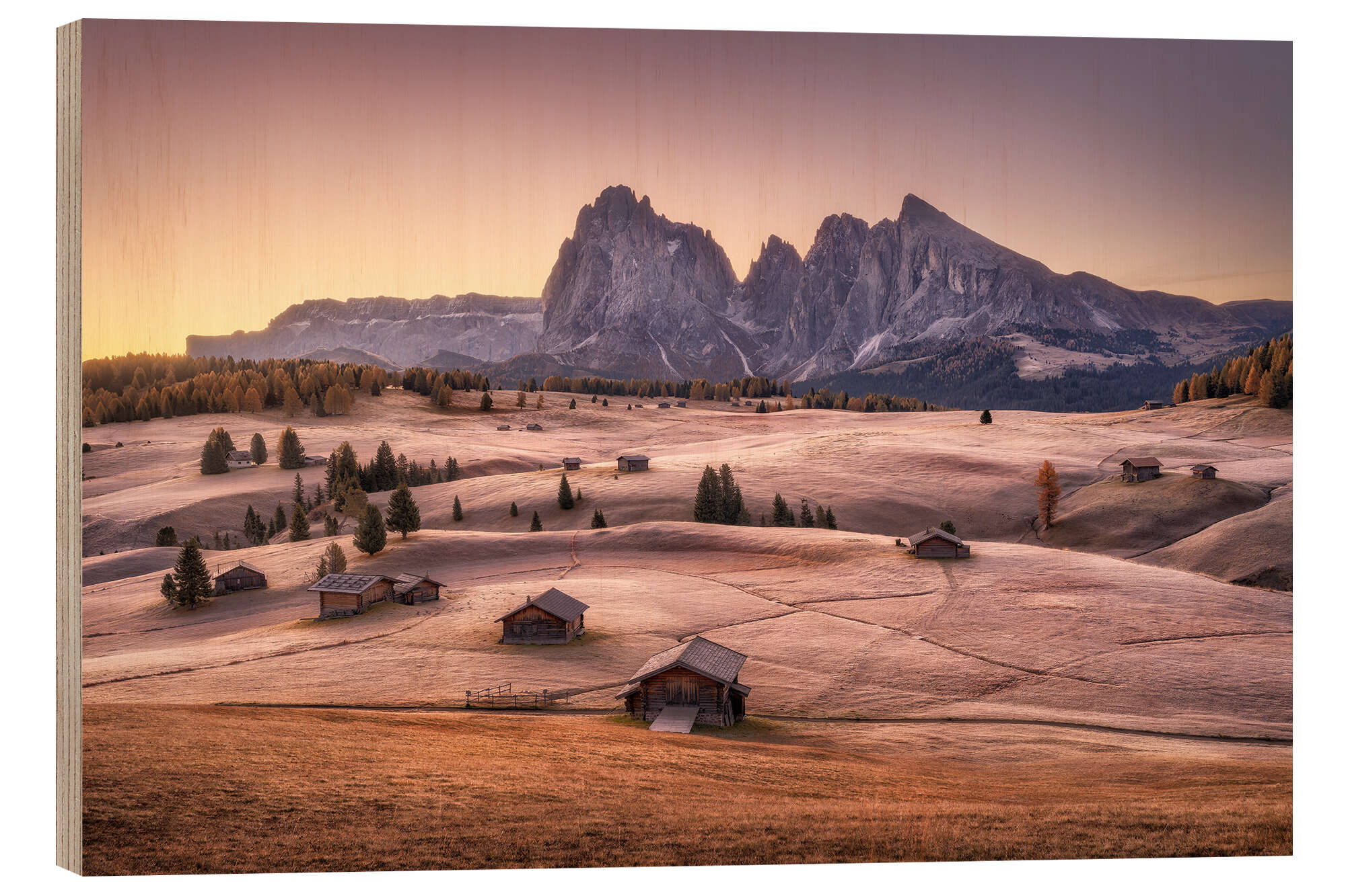 Holzbild Herbstmorgen auf der Seiseralm, Südtirol