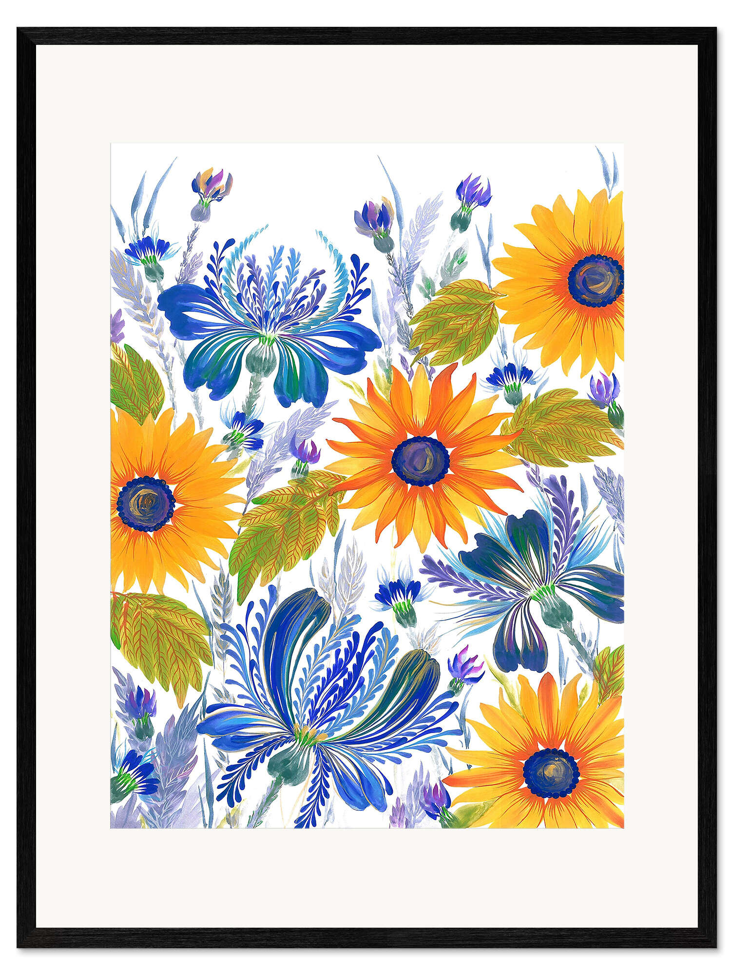 Gerahmter Kunstdruck Kornblumen und Sonnenblumen im Petrykivka-Stil
