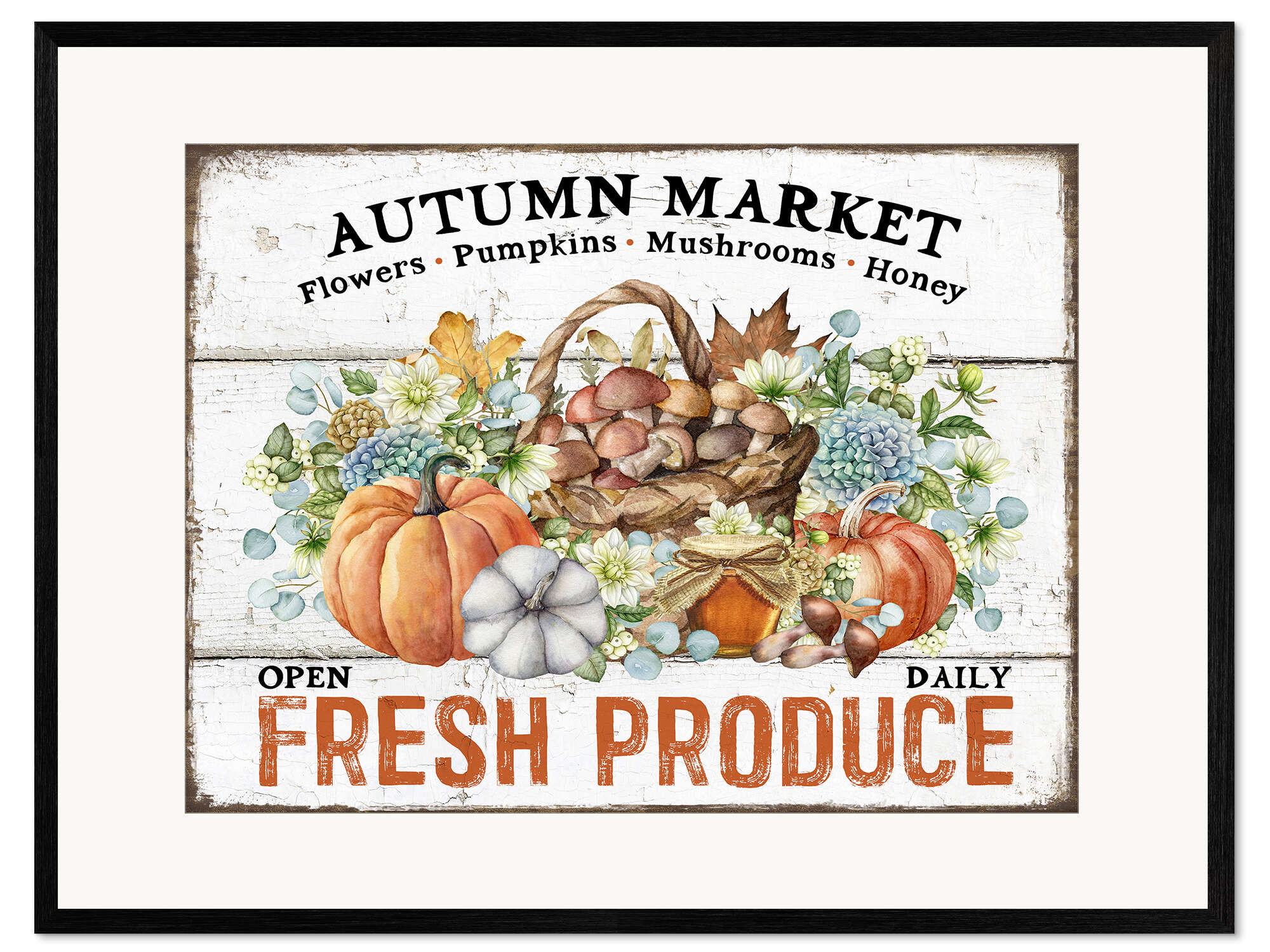 Gerahmter Kunstdruck Autumn Market - Blumen, Kürbisse, Pilze, Honig