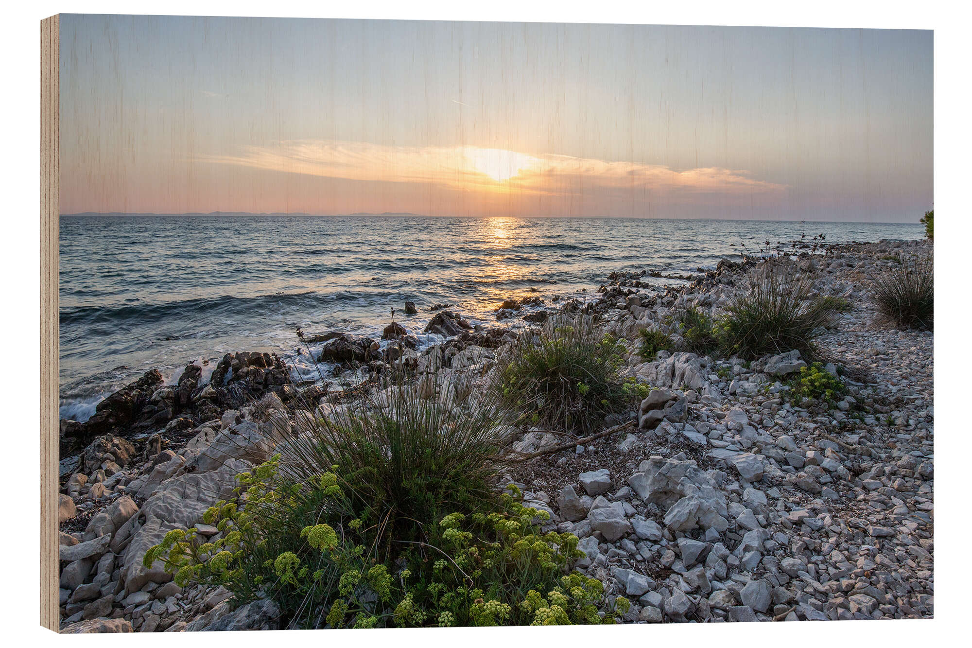 Posterlounge   Wandbilder   Landschaften   Strände & Küsten   Jan Wehnert   Holzbild Sonnenuntergang am Kieselstrand, Kroatien