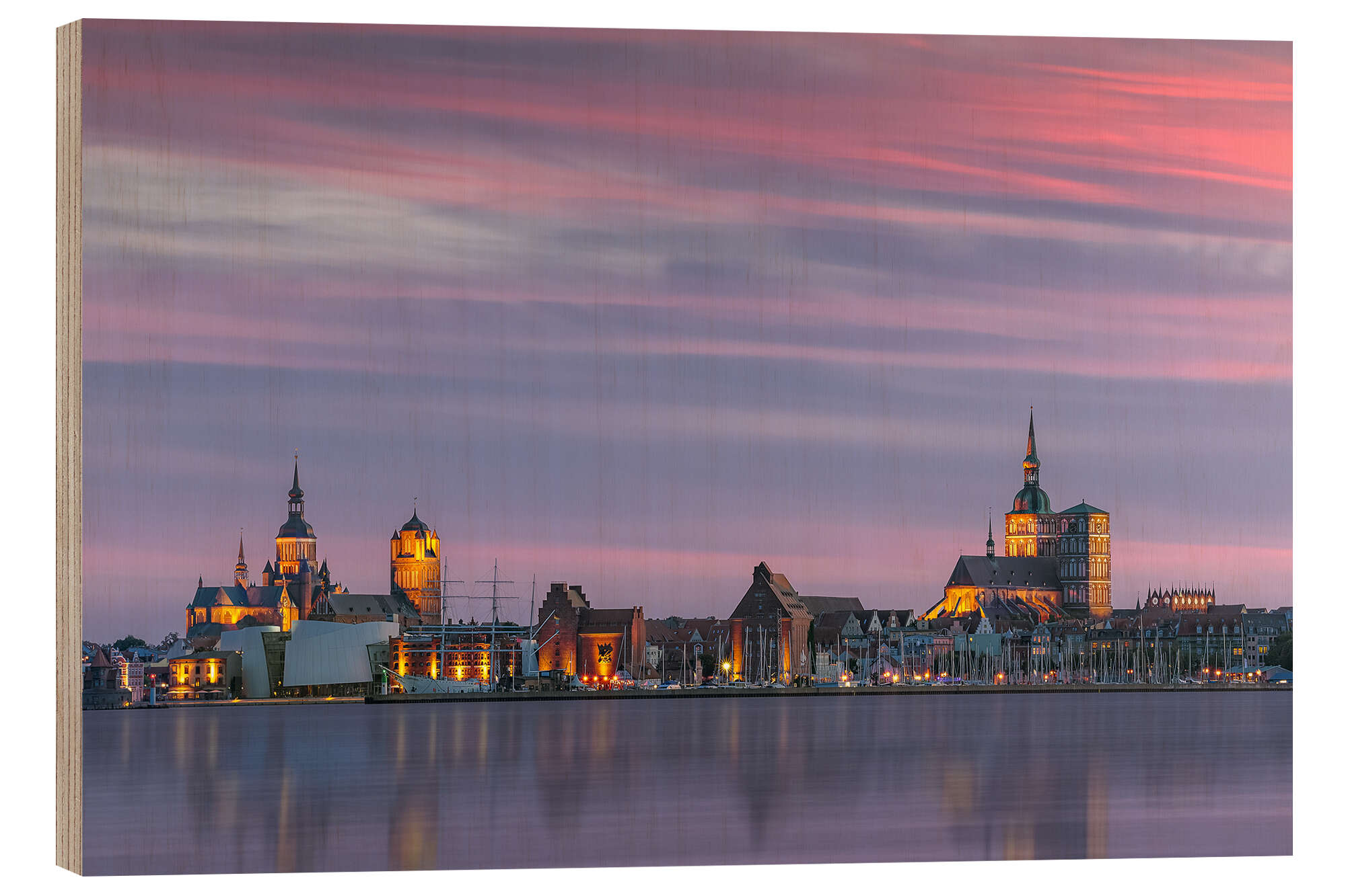 Posterlounge   Wandbilder   Lila   Kristian Goretzki   Holzbild Stralsund - Skyline im Sonnenuntergang