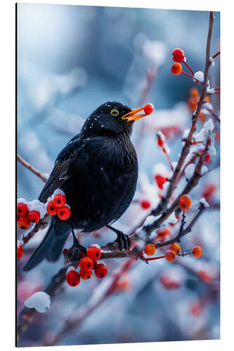Magnettafel Amsel im Winter mit roten Beeren