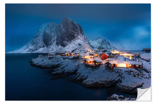 Posterlounge   Wandbilder   Blau   Andreas Wonisch   Wandsticker Verschneites Fischerdorf auf den Lofoten bei Nacht