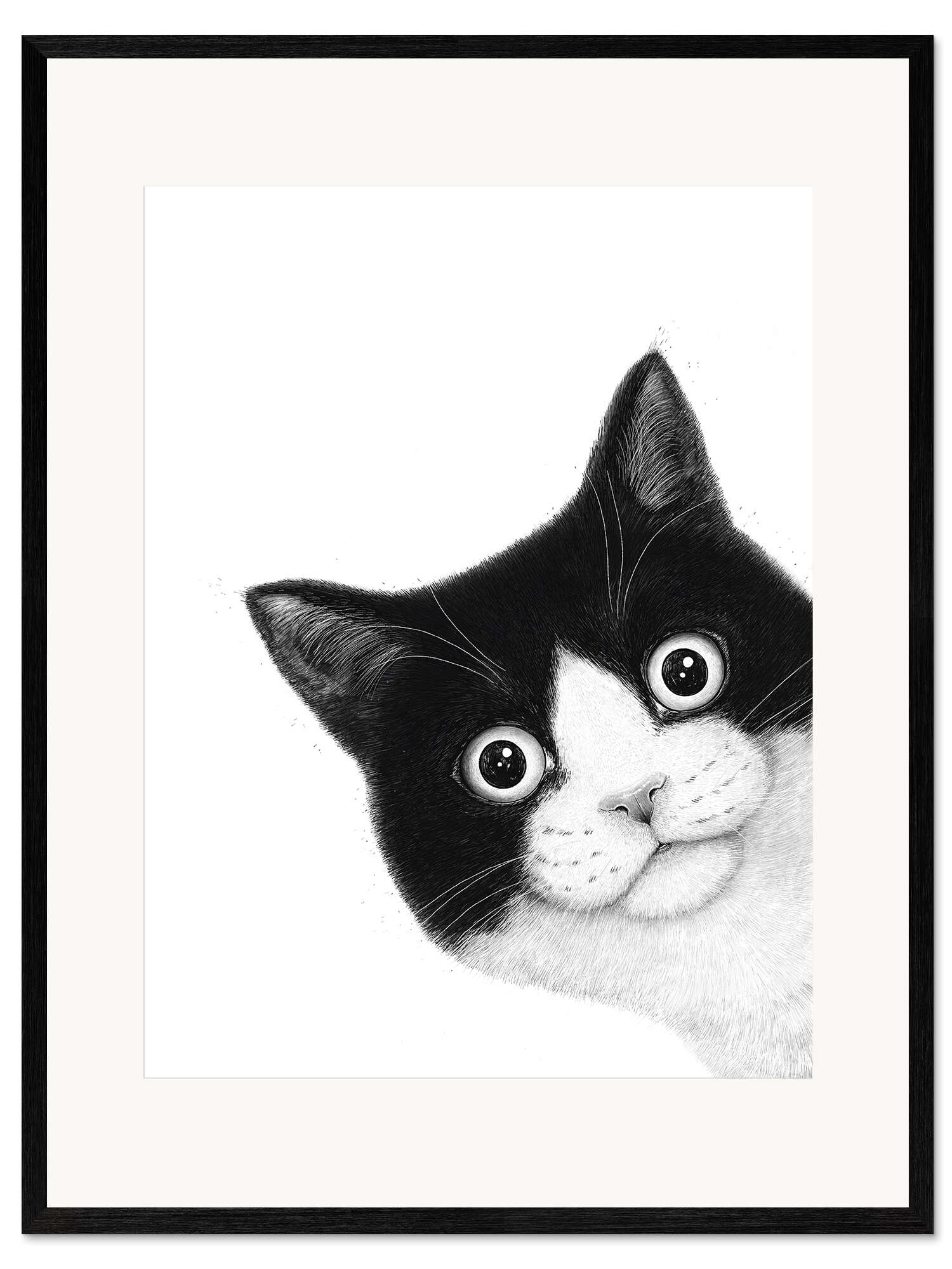Gerahmter Kunstdruck Überraschte schwarz-weiße Katze