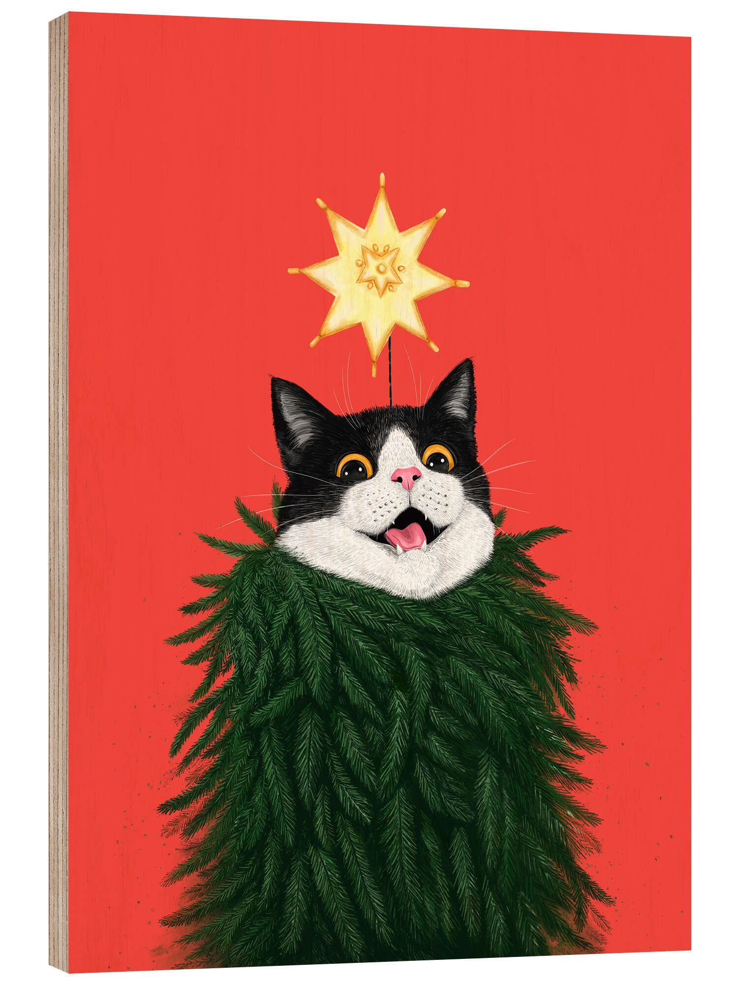 Holzbild Katze in einem Weihnachtsbaum