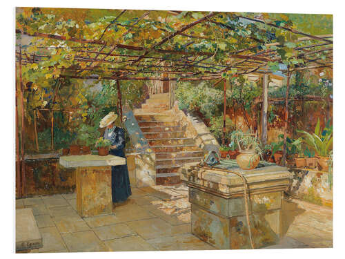 Hartschaumbild Eine Blumenliebhaberin auf der Sonnenterrasse