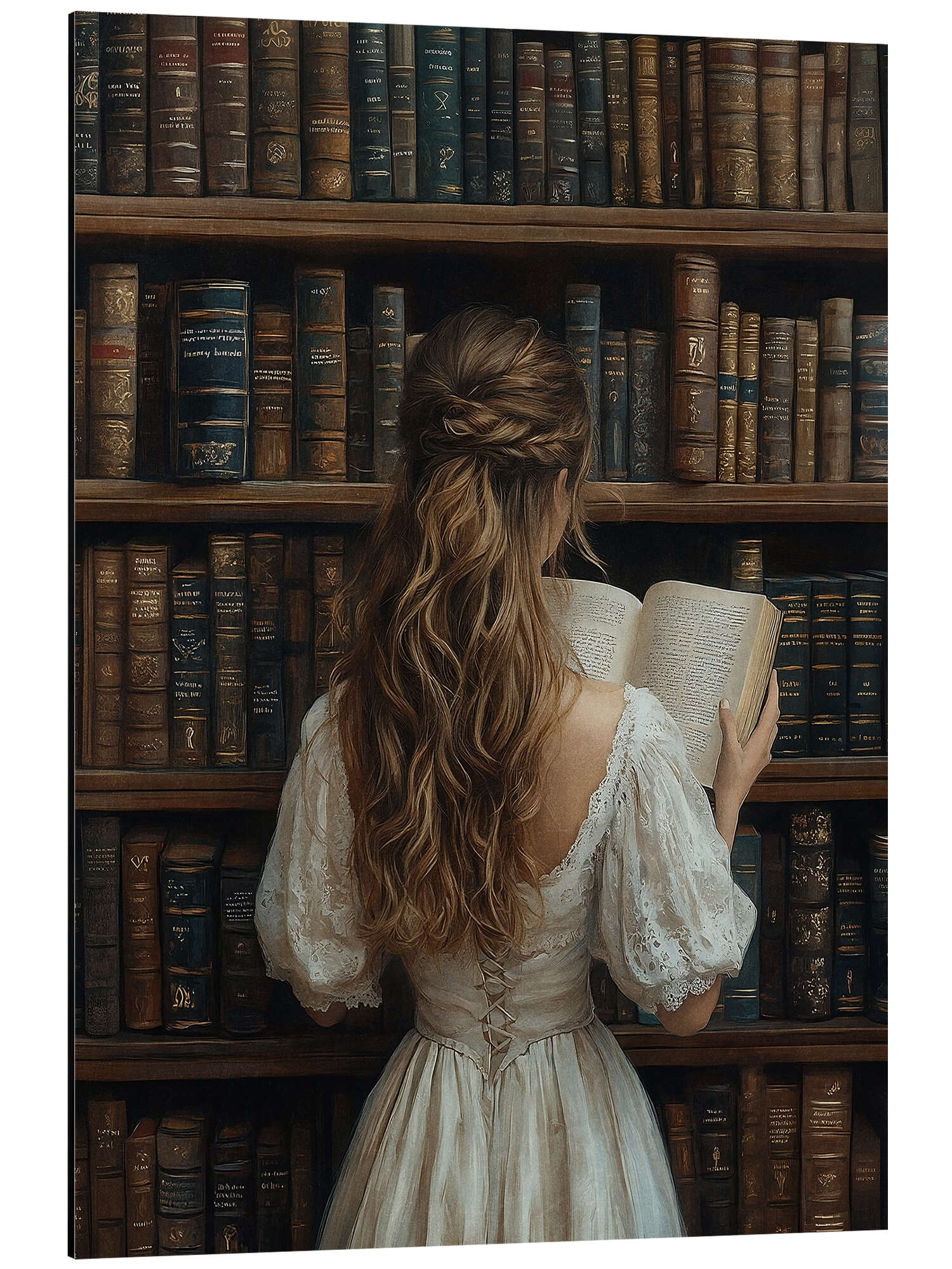 Alubild Mädchen liest ein Buch in der Bibliothek