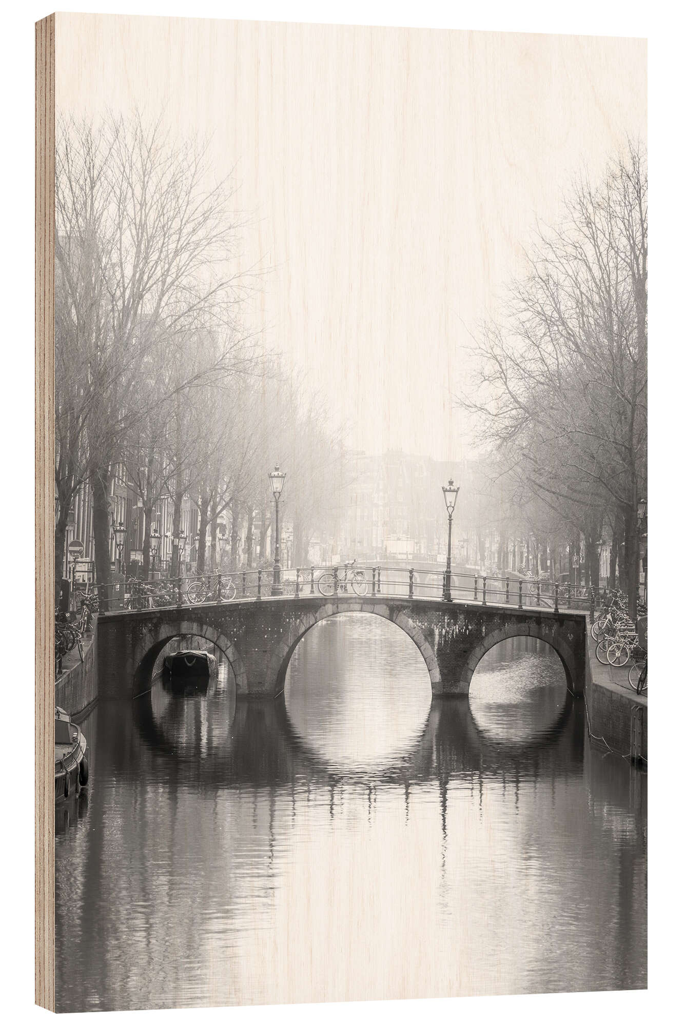 Holzbild Nebliger Morgen über einer historischen Kanalbrücke, Amsterdam