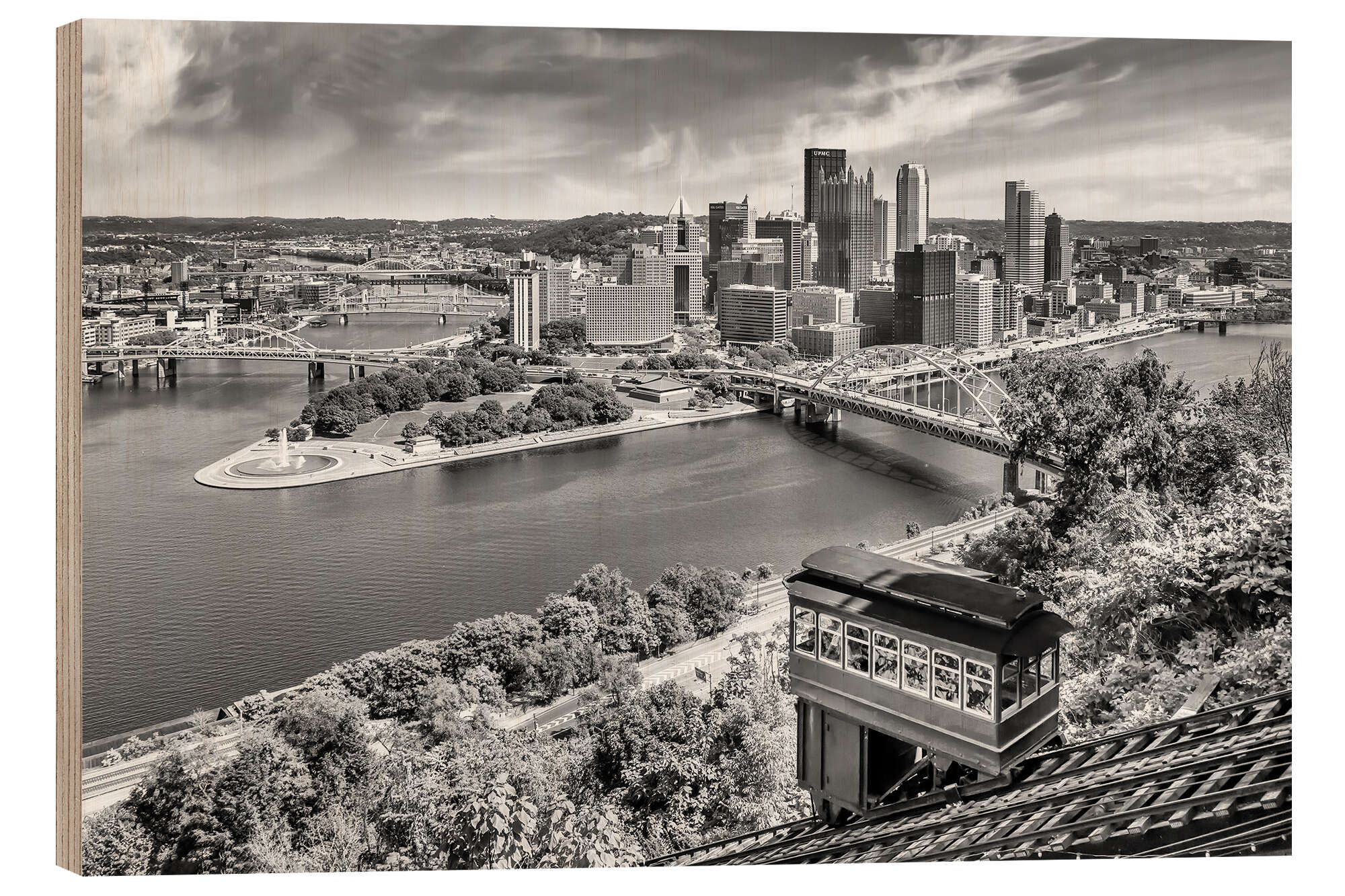 Holzbild Monochrome Pittsburgh Skyline mit Duquesne Incline