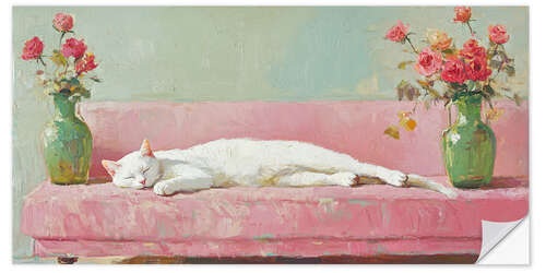 Wandsticker Weiße Katze auf einem rosa Sofa