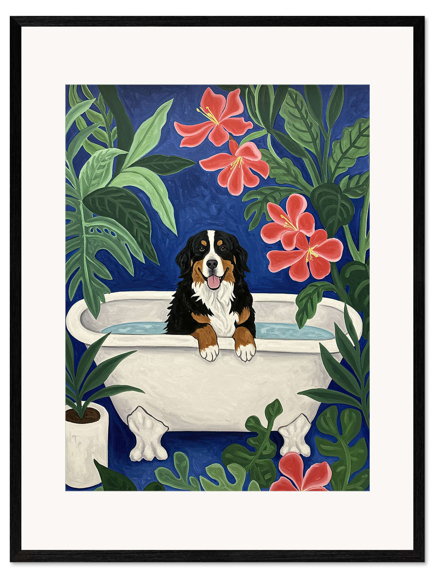 Gerahmter Kunstdruck Berner Sennenhund in der Badewanne