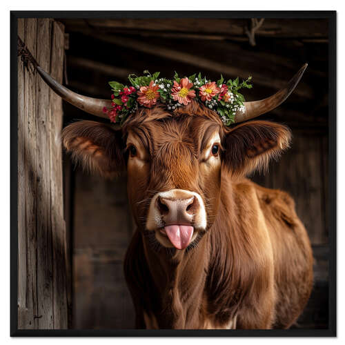 Posterlounge   Wandbilder   Tiere   Haustiere   Kühe   Thomas Klee   Gerahmter Kunstdruck Rind mit Blumenschmuck streckt Zunge raus