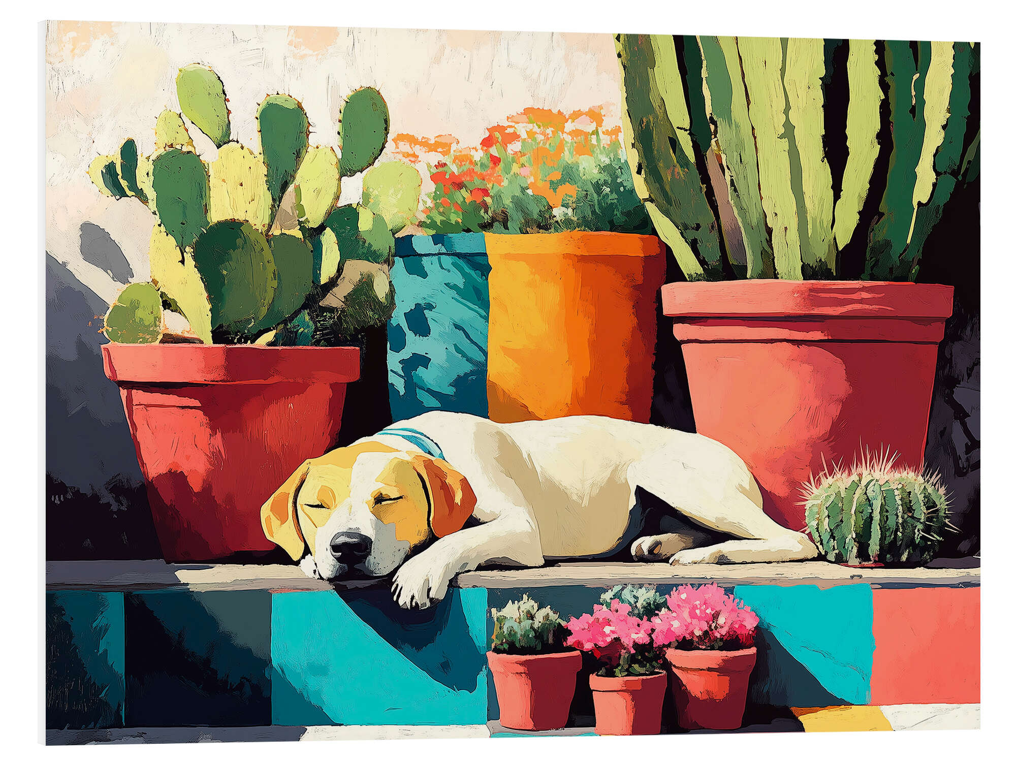 Hartschaumbild Schlafender Hund auf einer sonnigen Terrasse
