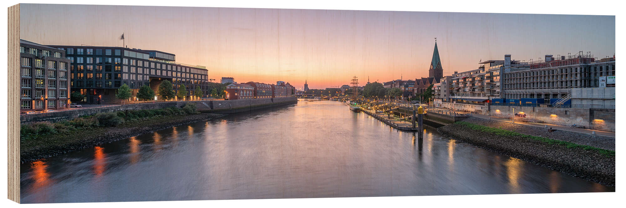 Holzbild Bremen Skyline bei Sonnenuntergang