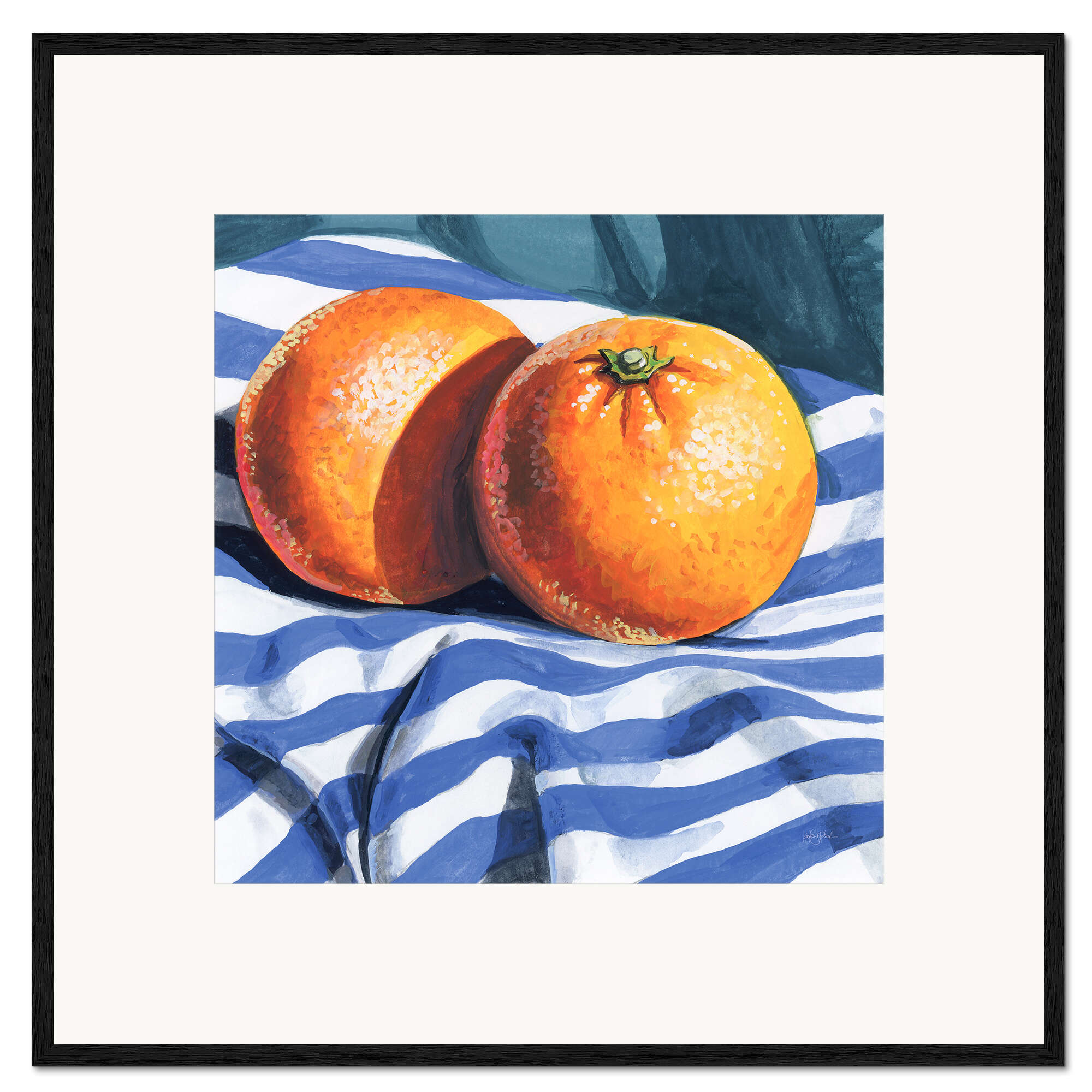 Gerahmter Kunstdruck Orangen auf gestreiftem Tuch