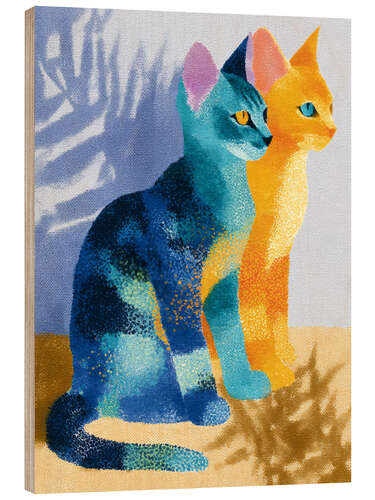 Holzbild Eine Katze in Orange und eine in Blau