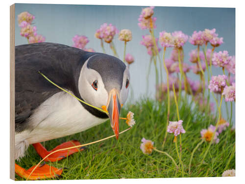Holzbild Blume im Schnabel, Atlantischer Papageientaucher