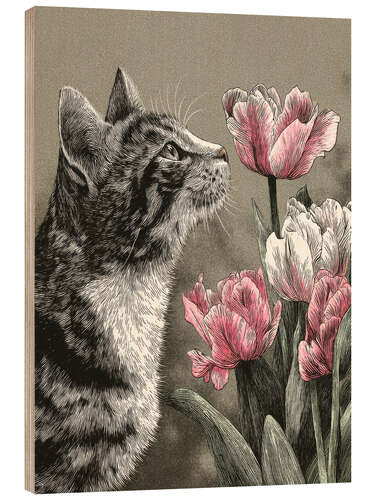 Posterlounge   Wandbilder   Blumen   Tulpen   DejaReve   Holzbild Katze schnüffelt an rosa Tulpen