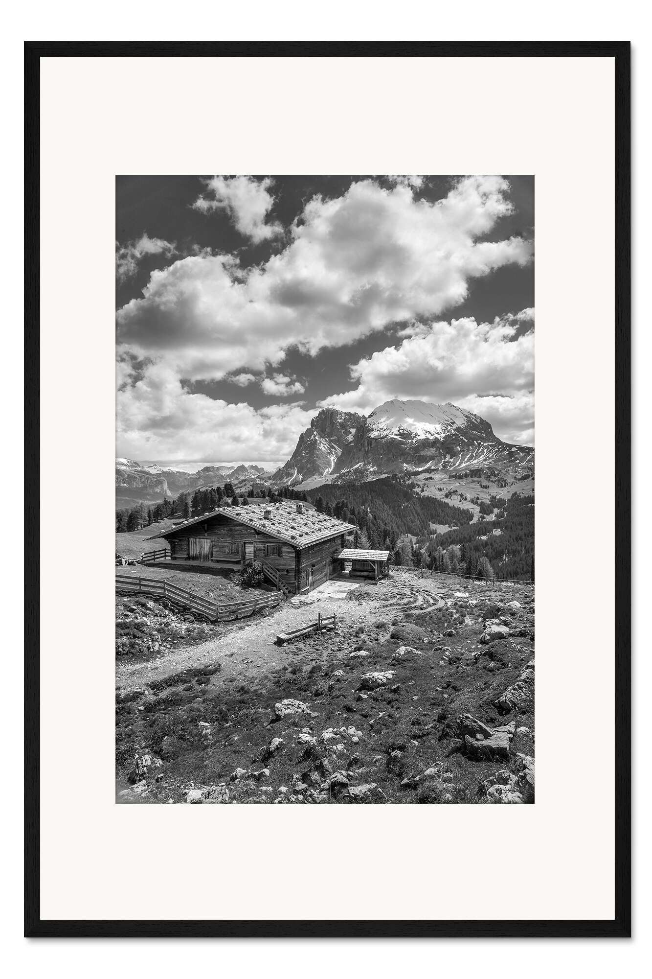 Posterlounge   Wandbilder   Schwarz-Weiß   Christian Müringer   Gerahmter Kunstdruck Almhütten auf der Seiser Alm, Südtirol