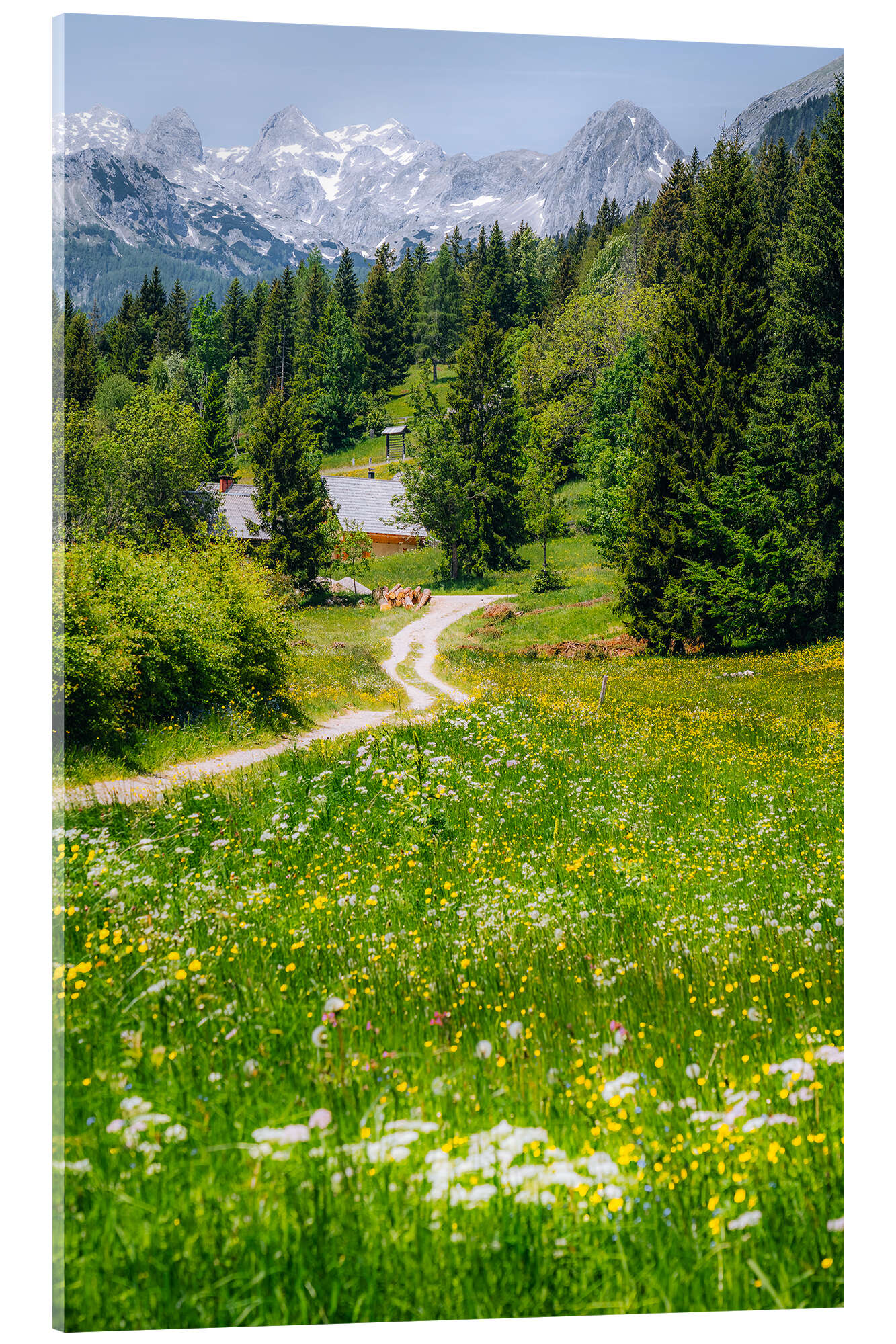Acrylglasbild Alpenidylle mit blühender Wiese und Bergpanorama