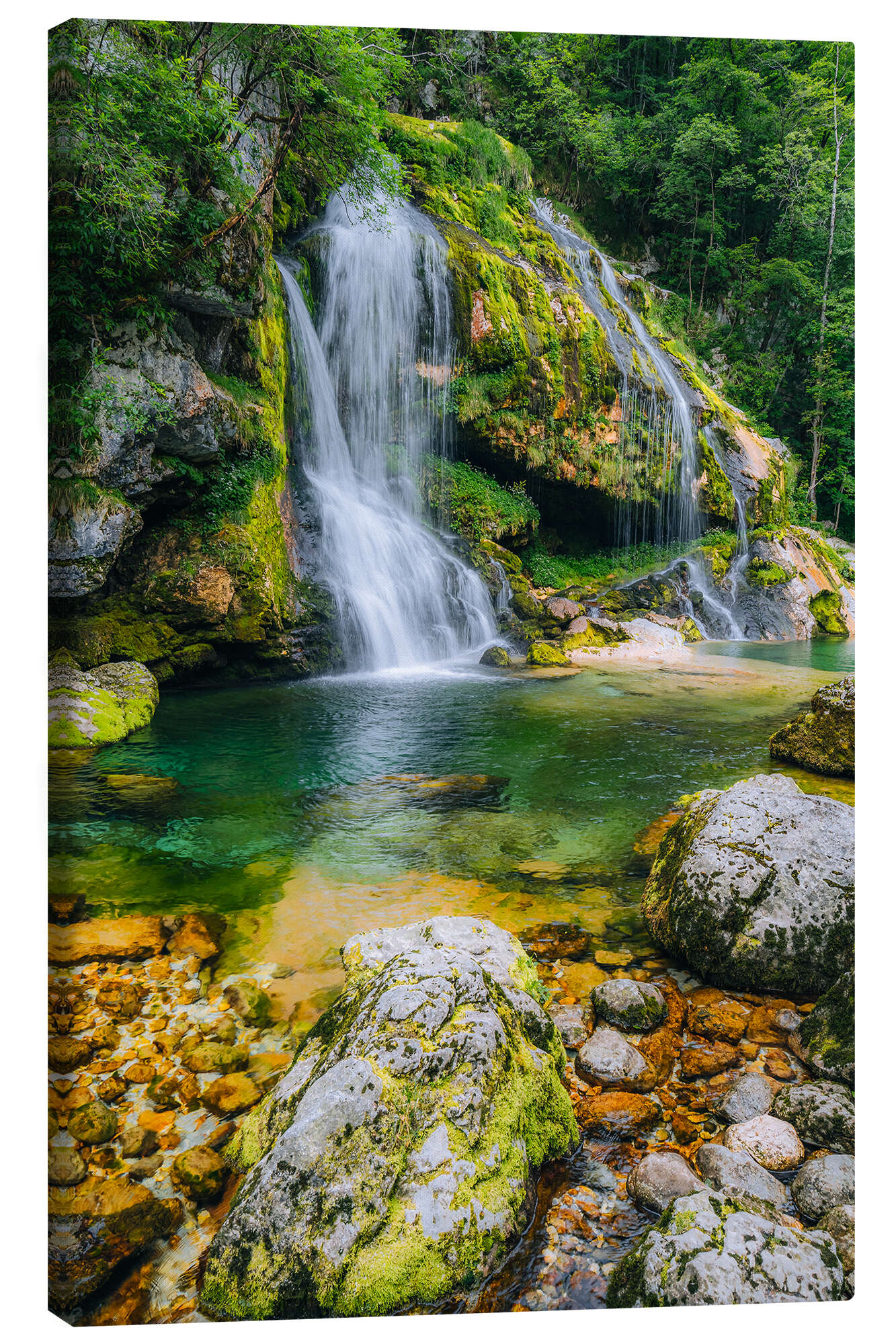 Posterlounge   Wandbilder   Natur   Wasser   Stefan Becker   Leinwandbild Kristallklarer Wasserfall im grünen Bergidyll