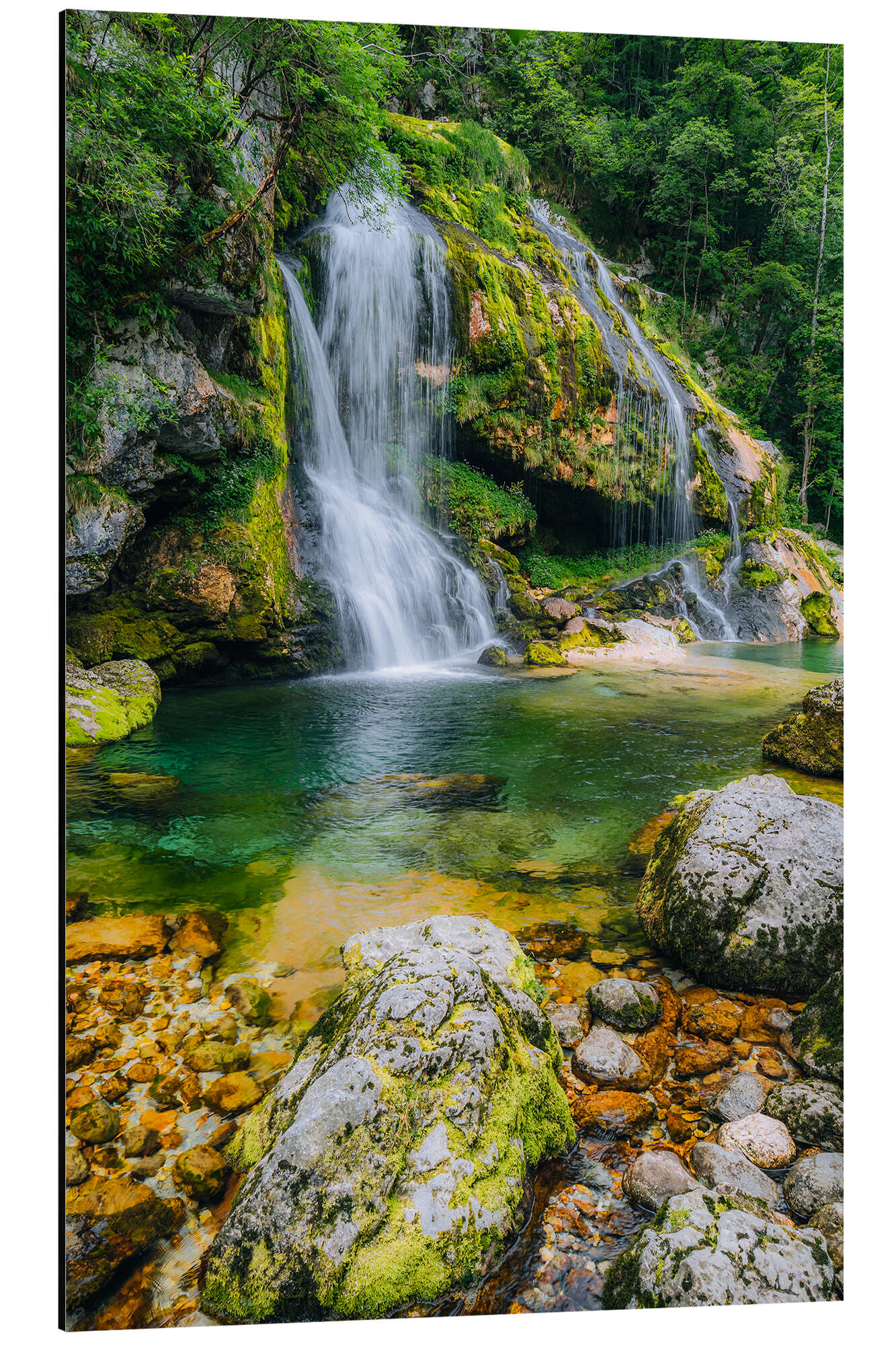 Alubild Kristallklarer Wasserfall im grünen Bergidyll