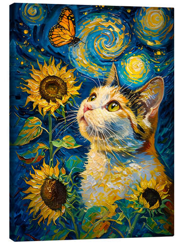 Posterlounge   Wandbilder   Blau   nobelart   Leinwandbild Gemälde mit Katze, Schmetterling und Sonnenblumen
