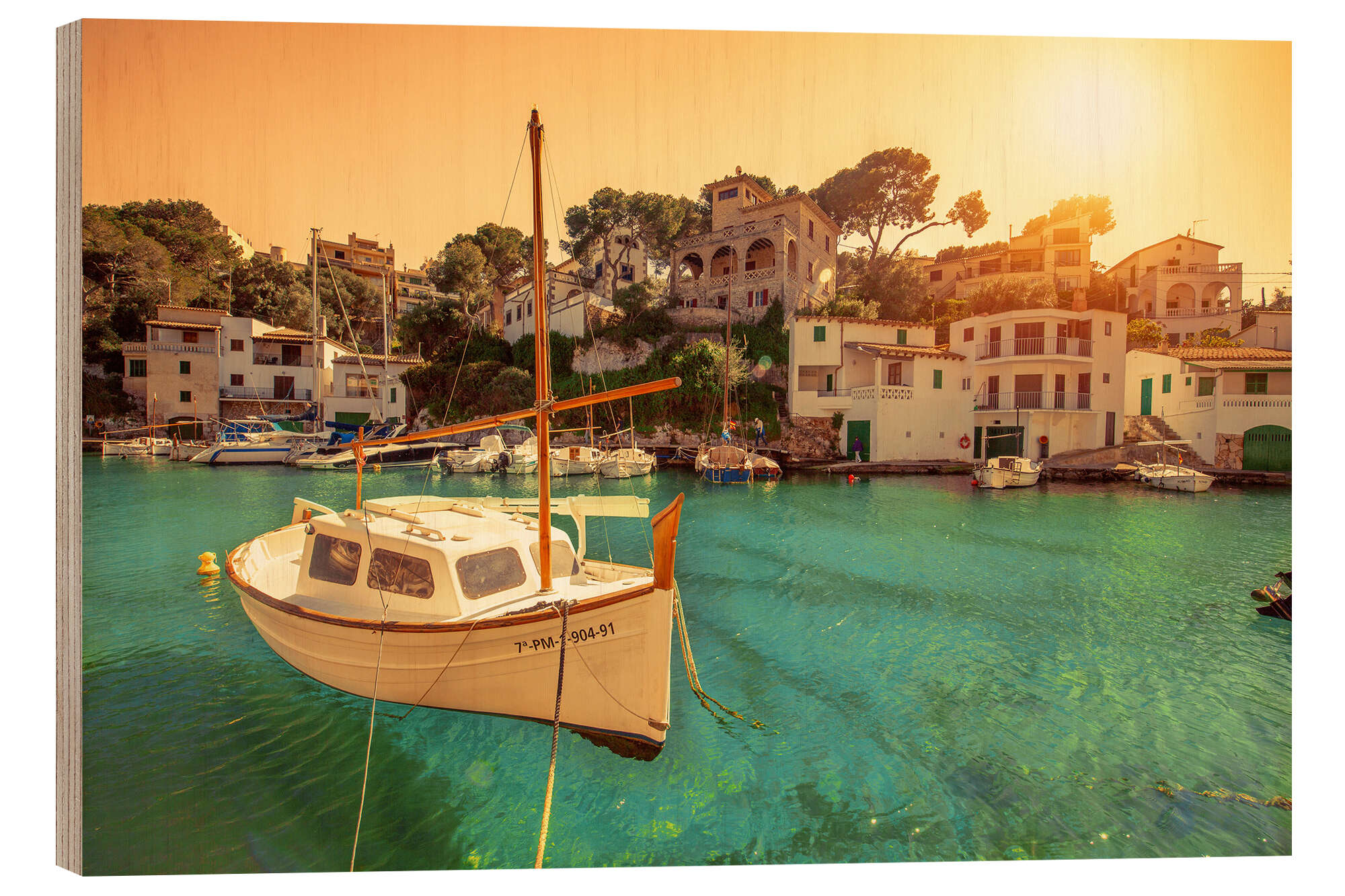 Posterlounge   Wandbilder   Landschaften   Strände & Küsten   pixelliebe   Holzbild Boot im Fischerdorf Cala Figuera auf Mallorca