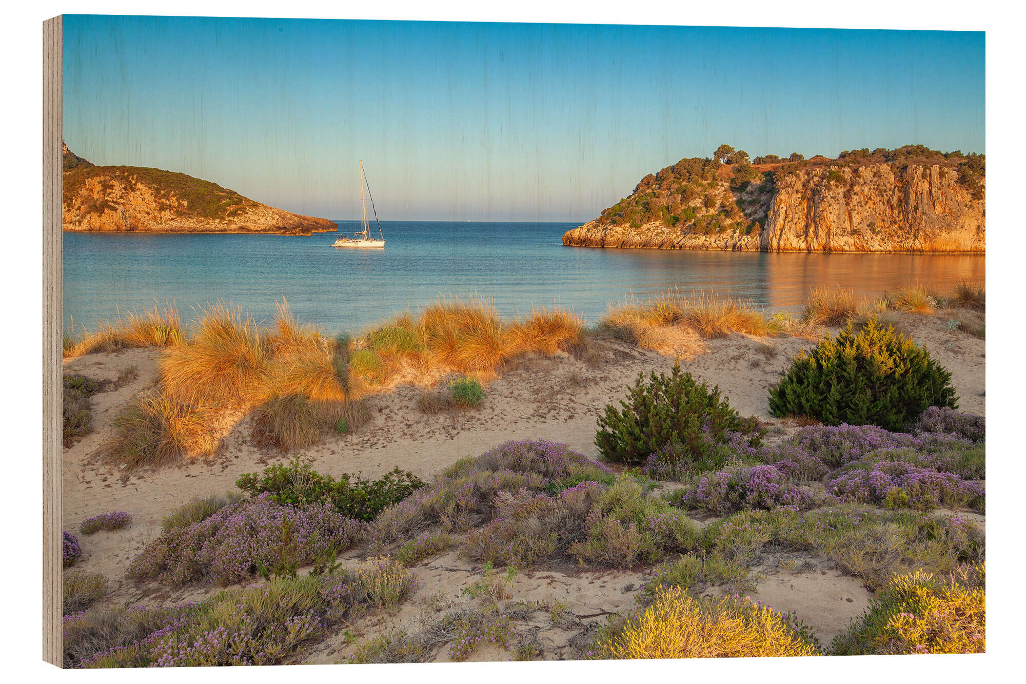 Posterlounge   Wandbilder   Landschaften   Strände & Küsten   pixelliebe   Holzbild Malerische Bucht bei Sonnenaufgang in Griechenland