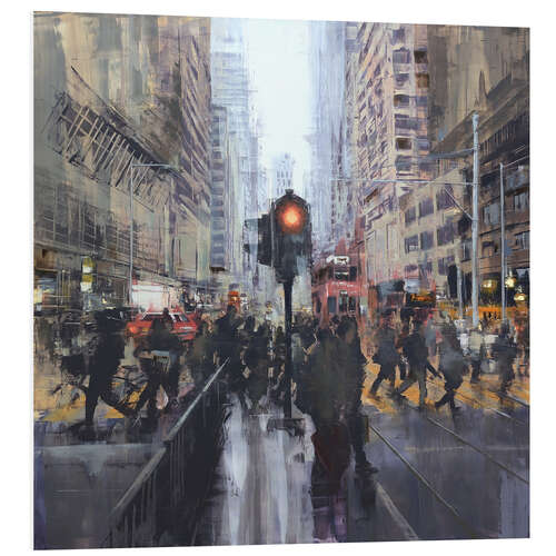 Hartschaumbild Straßenszene vor einer Tramhaltestelle in Hong Kong