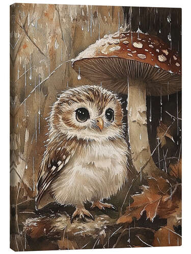 Leinwandbild Kleine Eule unter einem Pilz