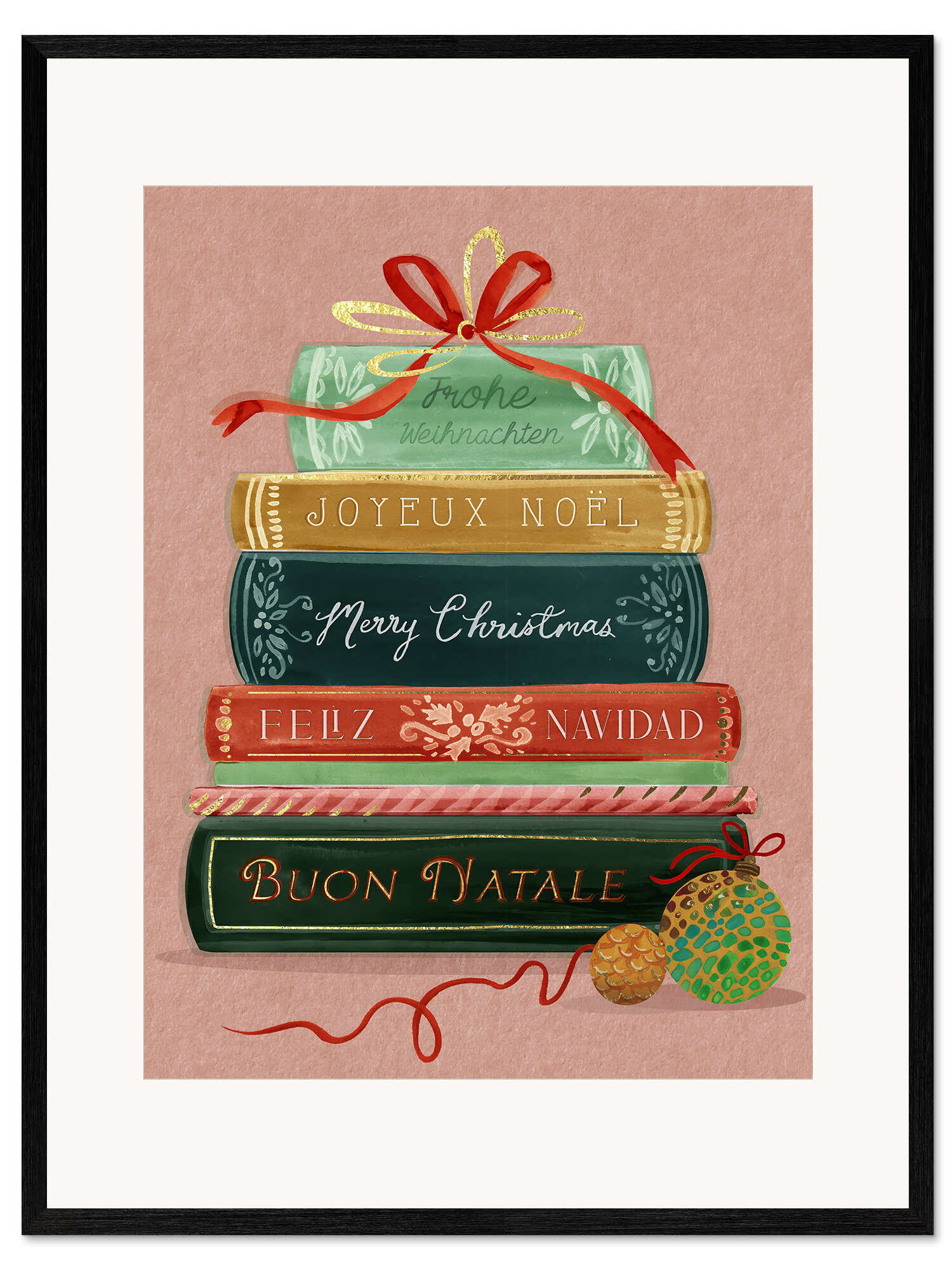 Gerahmter Kunstdruck Frohe Weihnachten mit internationalen Büchern