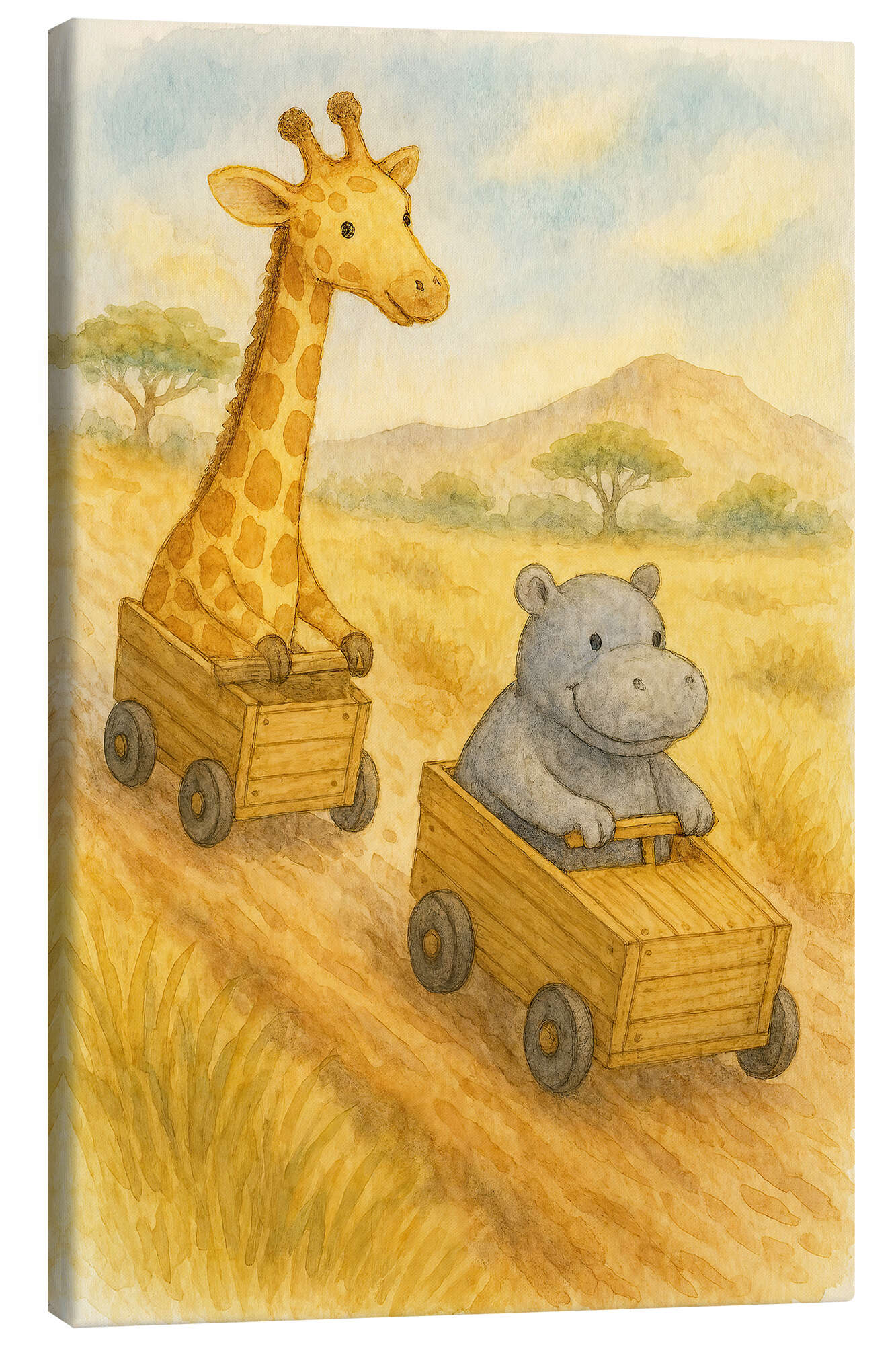 Leinwandbild Giraffen- und Nilpferdrennen in hölzernen Rennwagen
