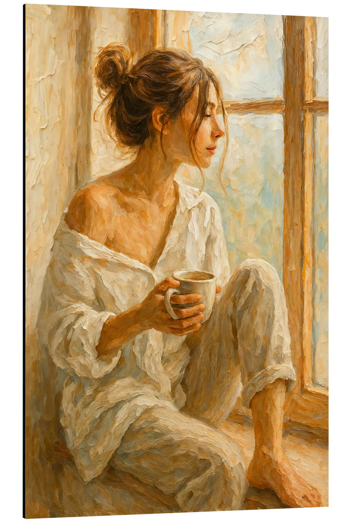 Alubild Frau mit Kaffee sitzt am Fenster