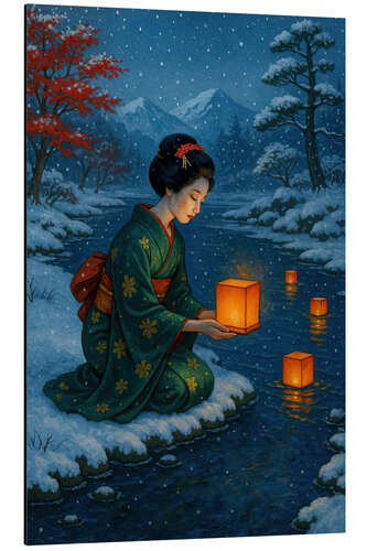 Magnettafel Frau im Kimono mit Laternen auf verschneiten Fluss