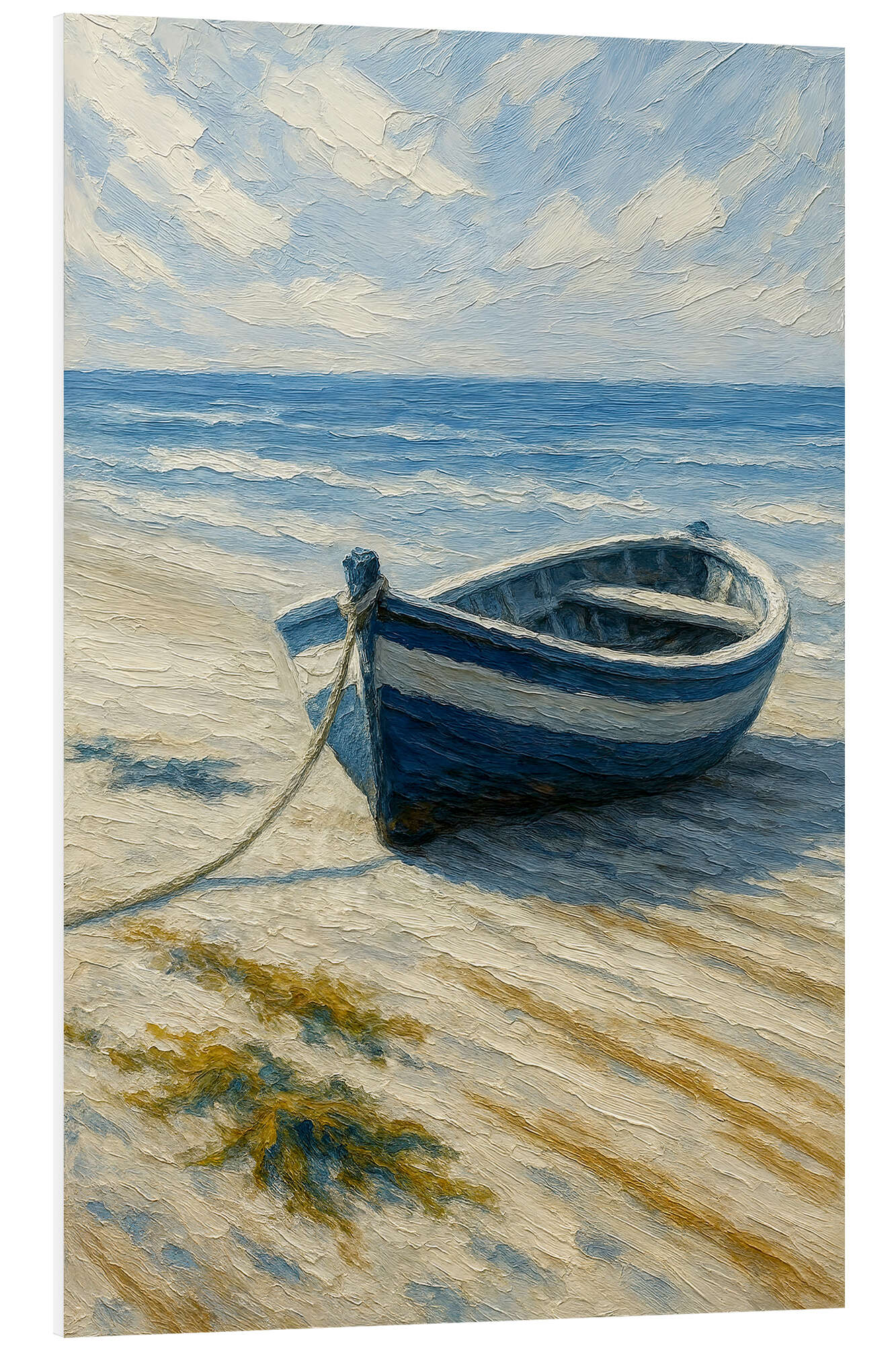 Hartschaumbild Blaues Fischerboot am Sandstrand