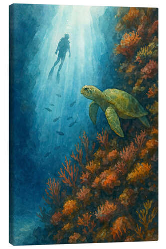 Leinwandbild Taucher mit Meeresschildkröte am Korallenriff