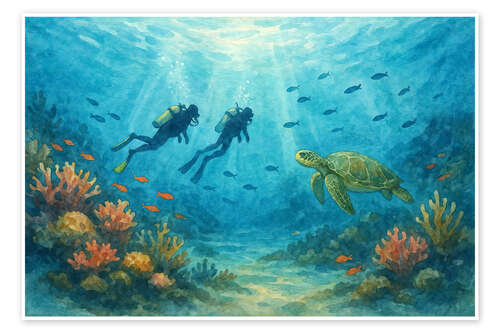 Posterlounge   Wandbilder   Natur   Unterwasser   Natalie Bruns   Poster Taucher mit Meeresschildkröte und Korallenriff