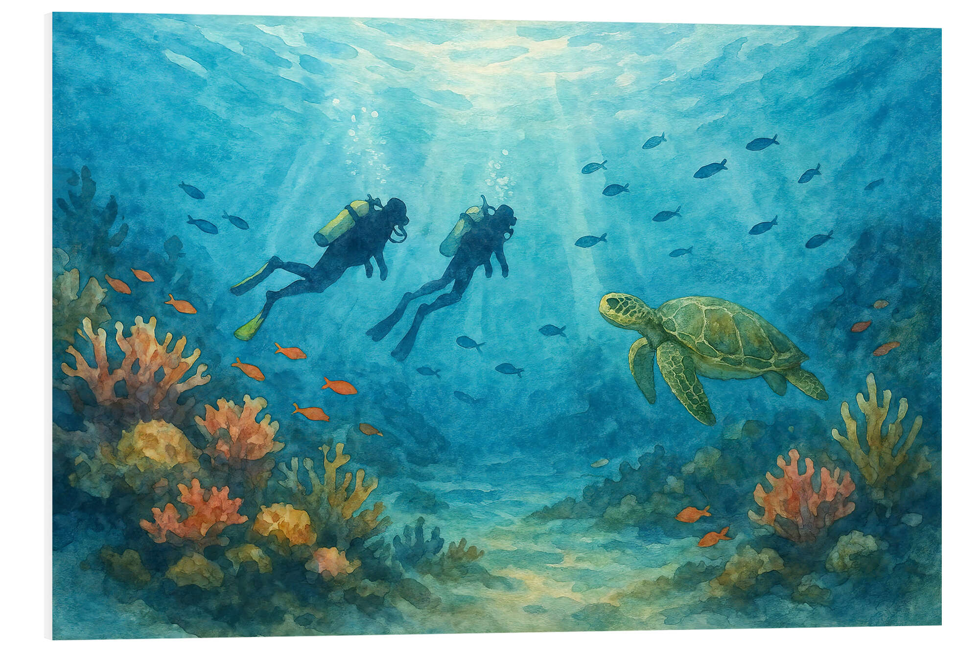 Posterlounge   Wandbilder   Natur   Unterwasser   Natalie Bruns   Hartschaumbild Taucher mit Meeresschildkröte und Korallenriff