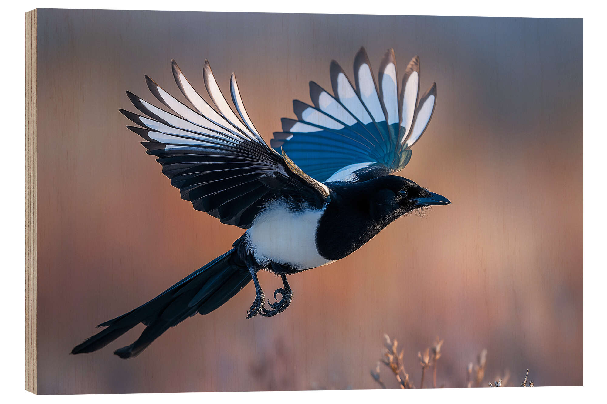 Holzbild Elster im Flug