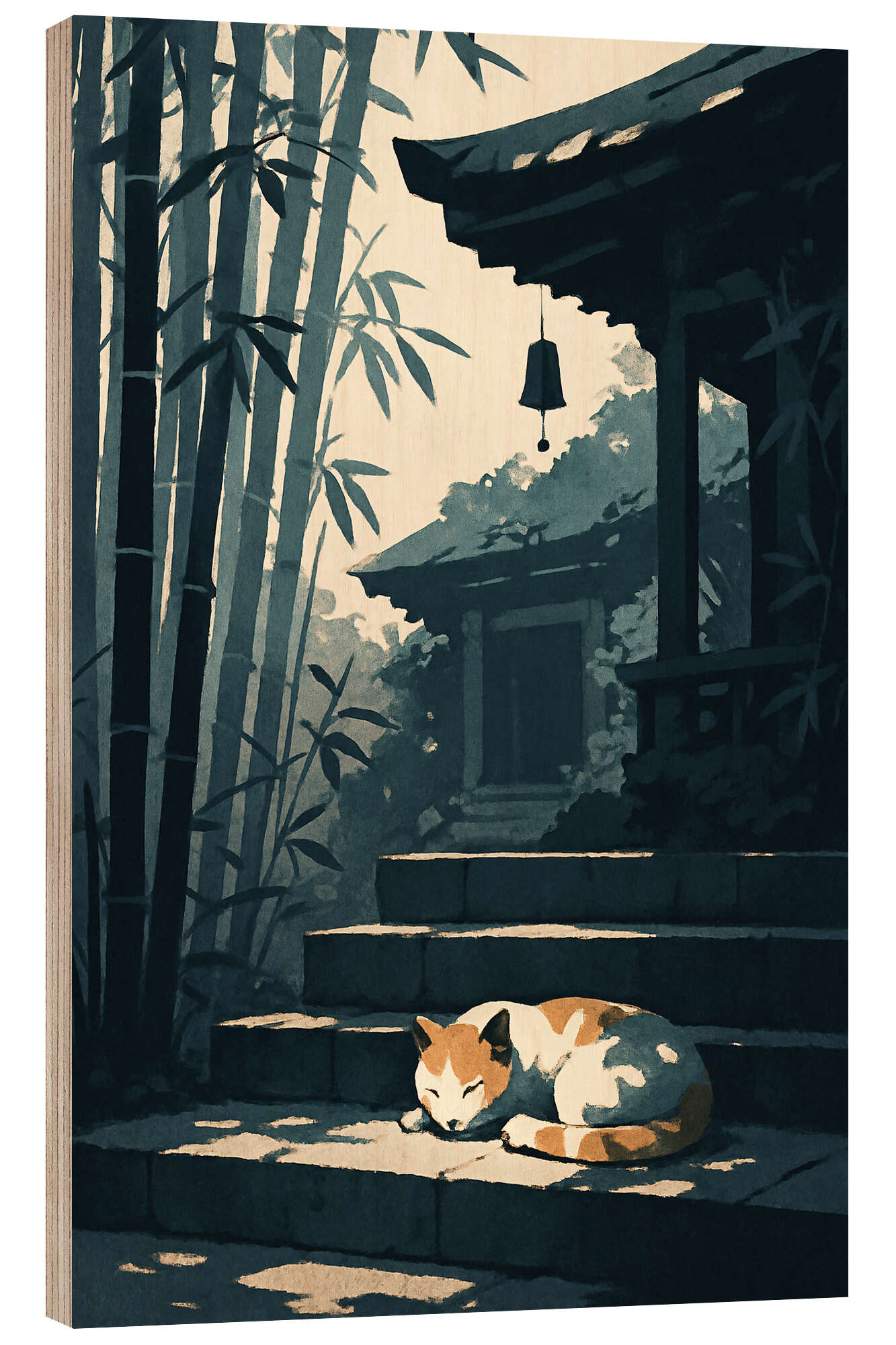 Holzbild Schlafende Katze auf Tempelstufen