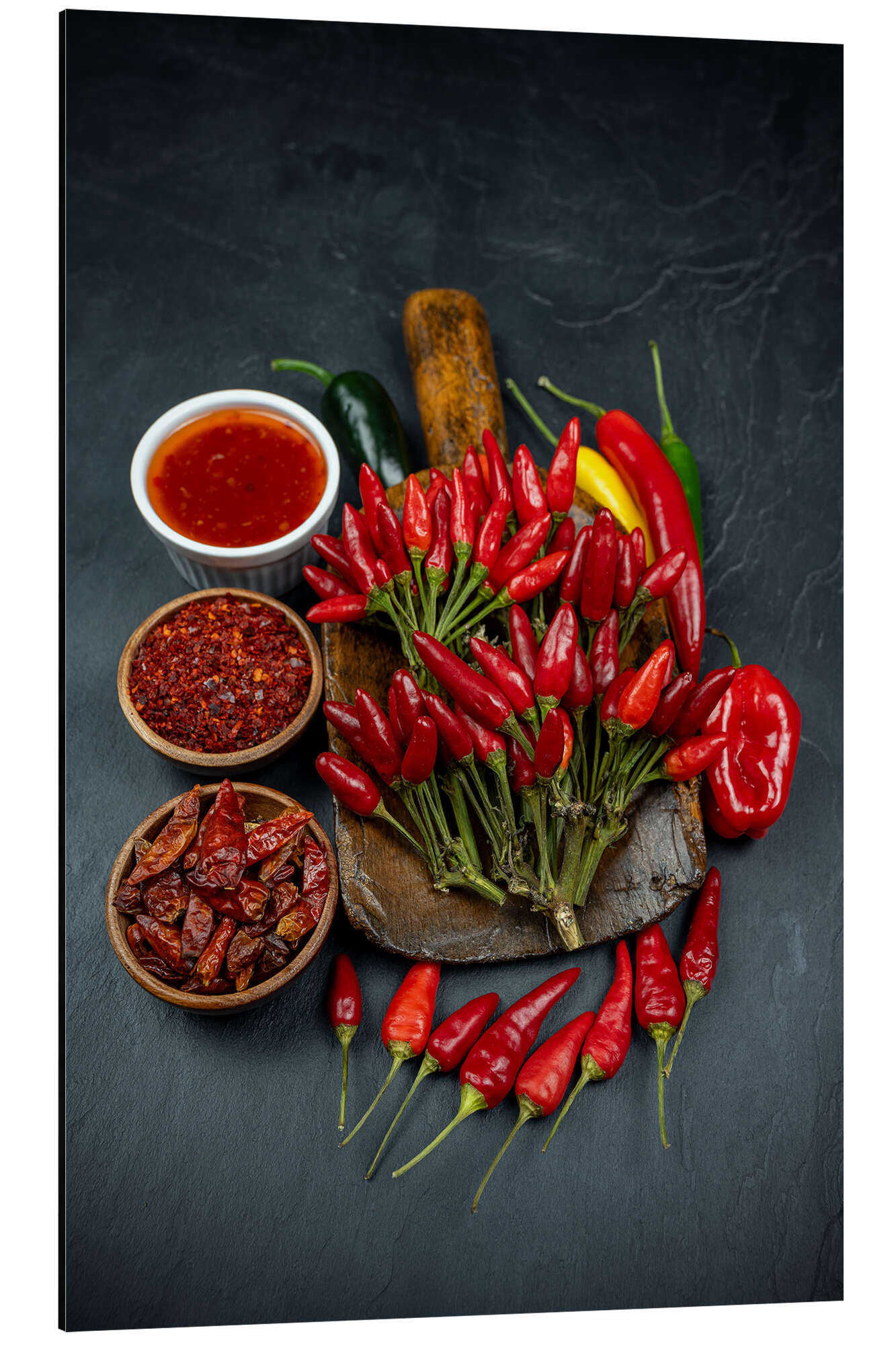 Posterlounge   Wandbilder   Fotografie   Thomas Klee   Alubild Scharfe Chilis mit Gewürzen auf dunklem Schiefer