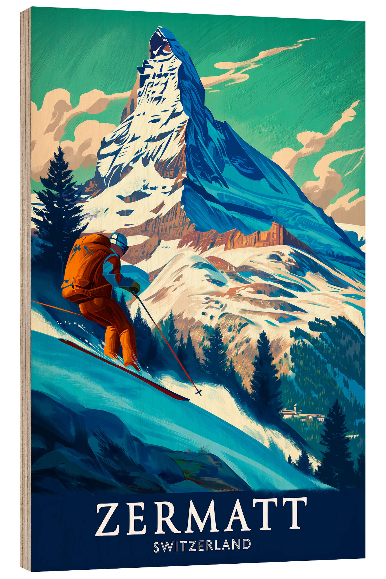 Holzbild Zermatt, Skifahrer am Matterhorn