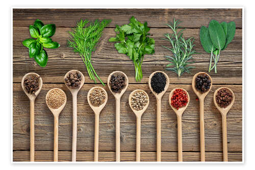 Posterlounge   Wandbilder   Fotografie   Thomas Klee   Poster Frische Kräuter und bunte Gewürze auf Holz